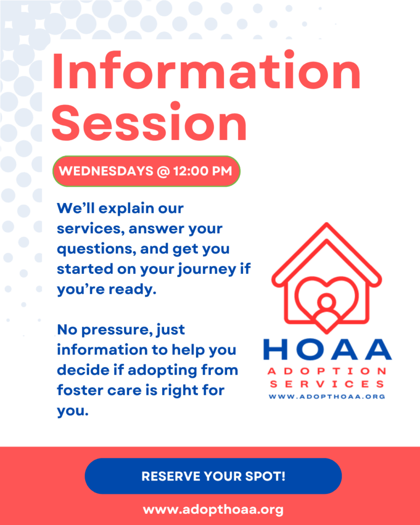 Join us for our virtual information session.   We’ll explain who we are, the services we provide, and how we can support you on your journey to adopt from foster care.